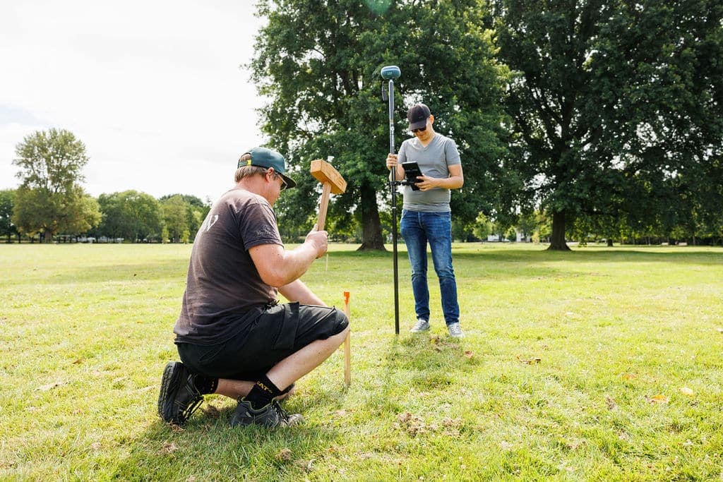 “We now start our work with the receiver, where it was with a tape measure previously. First, we measure the terrain to indicate where buildings and objects are or where we are dealing with differences in height. Then, we check whether the drawing we received is on the correct coordinates. We will fill this drawing with the fixed, existing elements that will remain and according to the actual wishes of the customer after that. Think of tents, stages, sanitary facilities, and other elements. When the drawing is finished, we put markers on it. Before we start building the event, we will stake out and use stakes sphere to get started.”