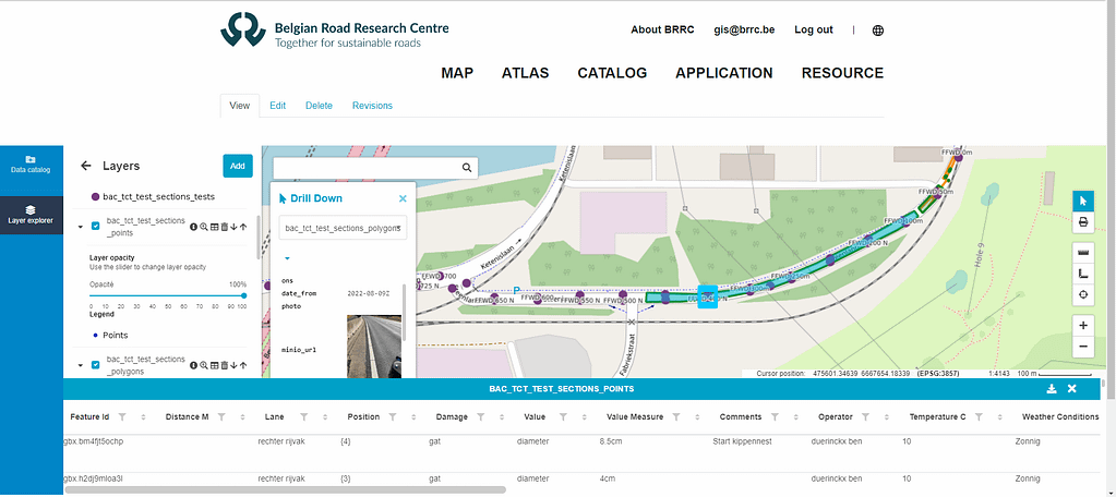 Die digitale Vermessung zentimetergenauer Daten ist zu einem festen Bestandteil des Arbeitsablaufs bei BRRC geworden. Ben: "Wir nutzen diese Informationen mit unserer eigenen GIS-Software für verschiedene Zwecke. Dazu gehört die Digitalisierung unserer (täglichen) Aktivitäten, wie z.B. die Angabe von Prüfstellen auf Testabschnitten zur späteren Verwendung, visuelle Inspektionen, die Messung der Dichte von Asphaltbelägen sowie die technologische Unterstützung aller Unternehmen und Einzelpersonen im Straßenbau. Nehmen wir zum Beispiel die Testabschnitte. Wir generieren genaue Daten, wenn wir sie anlegen, und verwenden dieselben Informationen, um genau dieselbe Stelle wiederzufinden, wenn wir zur Überwachung und für Folgeuntersuchungen an diesen Ort zurückkehren."