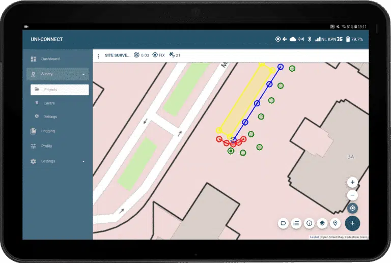 Gebruik de UNI-GR2 als een RTK rover, ontvang correcties over NTRIP of een plaatselijke UNI base en start met inmeten of uitzetten.